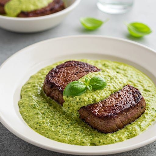 6. Return the cube steaks to the skillet and spoon the creamy pesto sauce over them. Simmer for an additional 2-3 minutes to heat the steaks through and allow the flavors to meld.