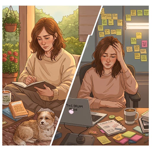 Right now? I’m in the in-between. Not stuck—just pre-launch. A slow burn. A quiet simmer before the big, beautiful boil. And if it takes 25 years until I retire into that dream? So be it. I’ll still be there—tea in hand, dog at my feet, garden wild and glorious, laptop open, telling stories that matter.