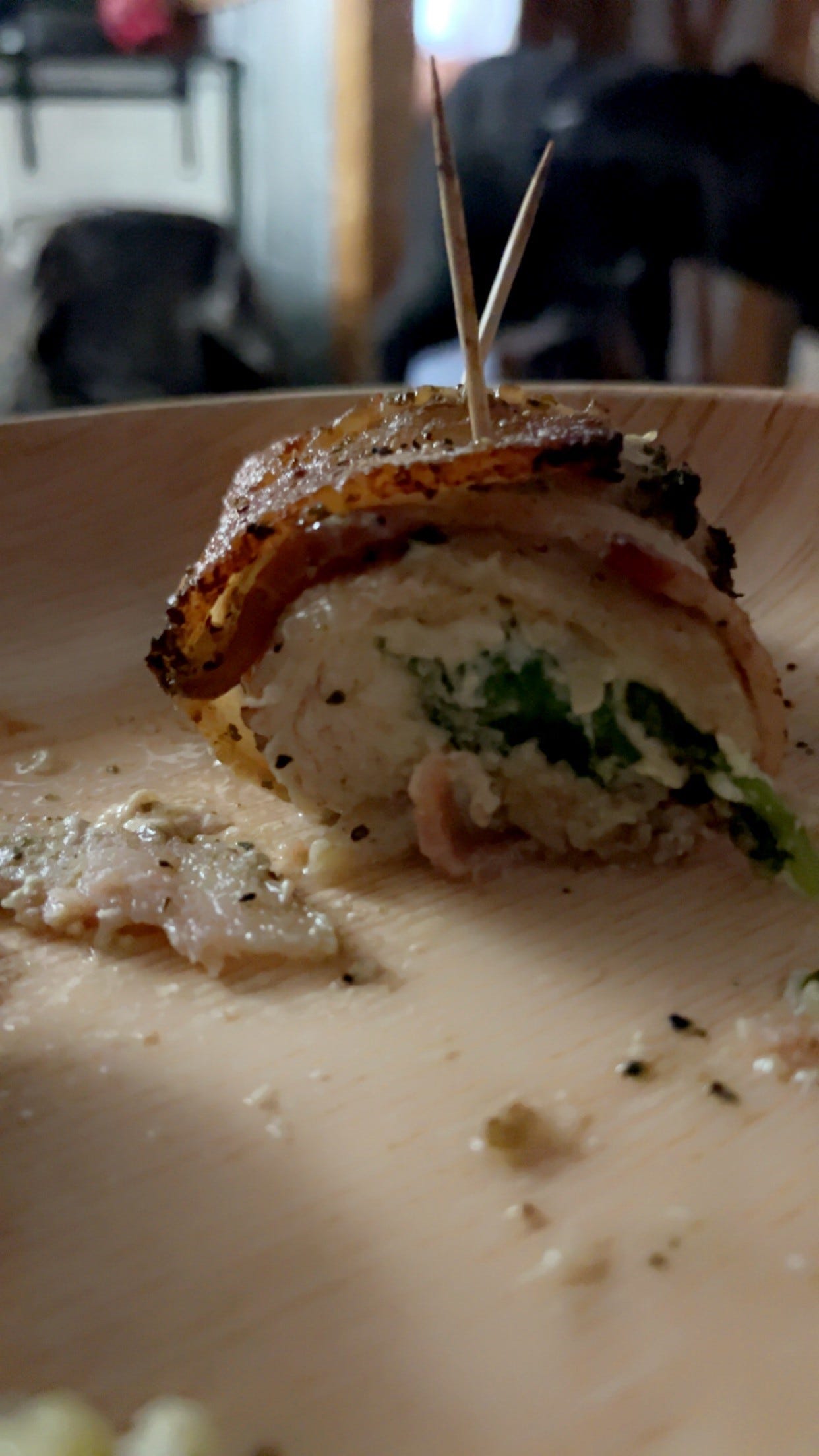 Wrap with Bacon: Wrap each stuffed chicken tender with a strip of jalapeño bacon, securing it with toothpicks as needed to keep the bacon in place.