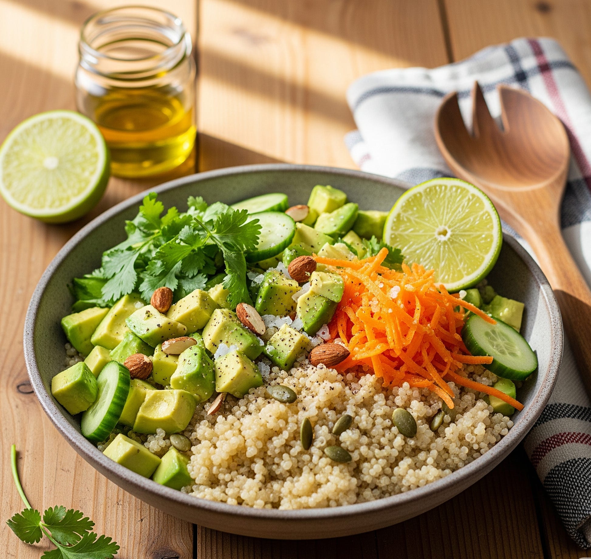 1. In a large bowl, combine the cooked quinoa, diced avocado, diced cucumber, shredded carrots, and chopped cilantro.