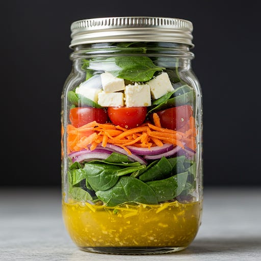 5. When you're ready to enjoy your salad, simply shake the jar to distribute the dressing evenly, then pour the salad into a bowl and toss if desired. Enjoy your convenient and delicious salad on the go!