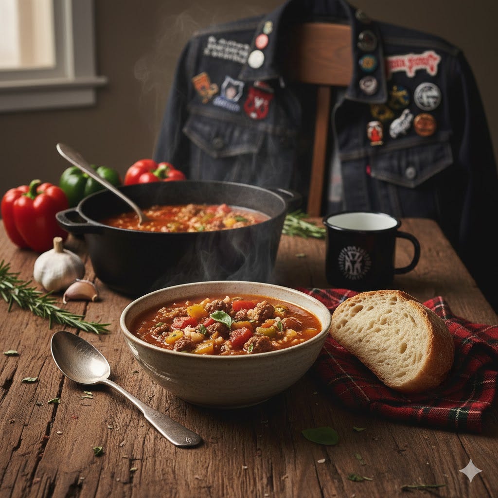 Brown meat on stovetop. Add veggies, rice, broth, tomatoes. Simmer 20–25 min. Crockpot: add everything raw, cook low 6 hrs or high 3 hrs.