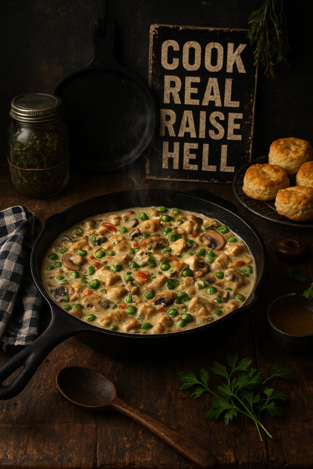 A creamy, soul-hugging classic remixed with whole, real ingredients. Tender turkey, garden-grown veggies, and a velvety broth come together in a skillet symphony that hits every cozy note. Swoon-worthy over biscuits, rice, noodles, or whatever you’ve crafted in your homestead kitchen.